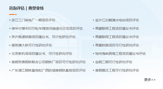 咨詢評估業務是中咨公司的特色業務和行業領先優勢的集中體現。中咨公司成立40 年來在重大工程、基礎工業、未來產業、鄉村振興、社會事業、區域發展、生態文明、國防軍工、一帶一路等方面作出了積極貢獻。